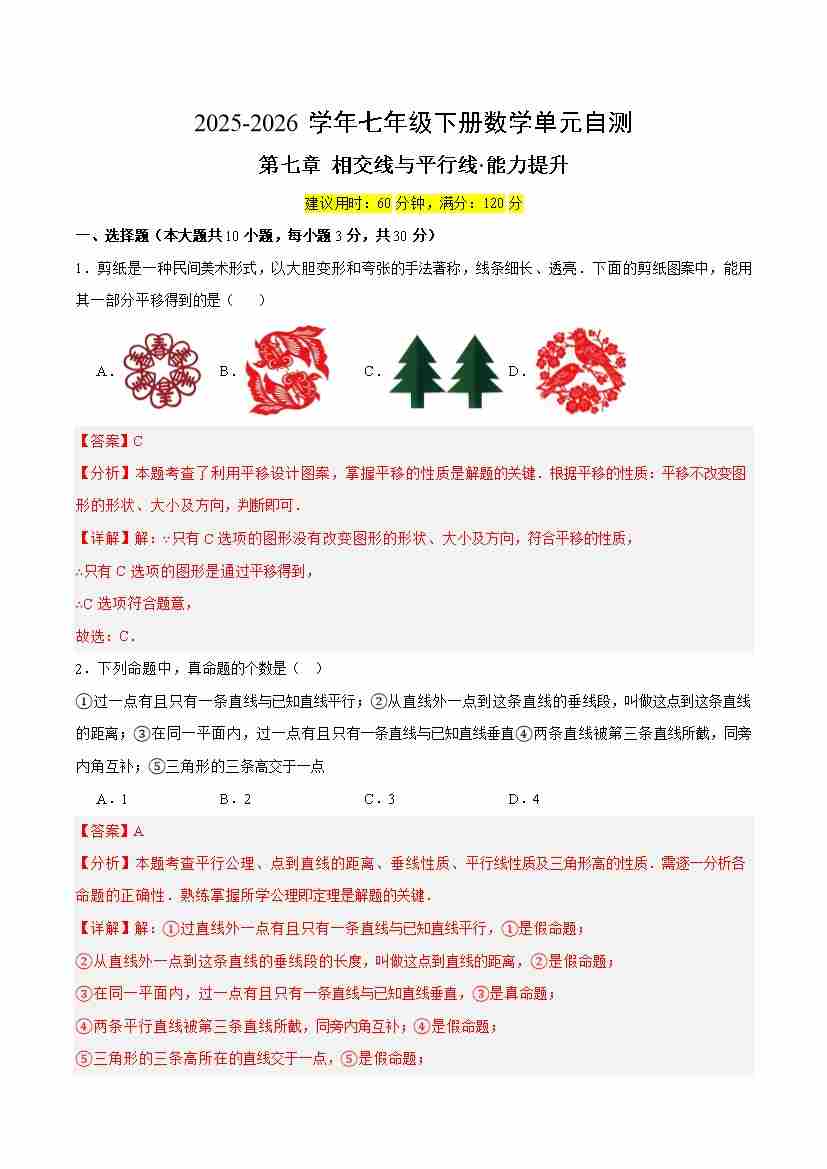 七下数学第七章 相交线与平行线·提升卷(解析版)