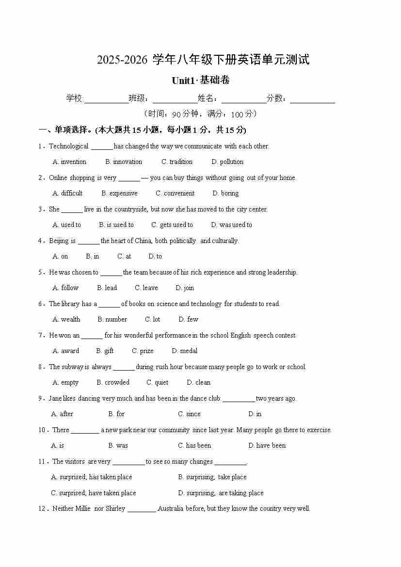 首页 > 全部 > 单元试卷 > 八年级英语下册Unit1单元自测·基础卷(考试版A4)