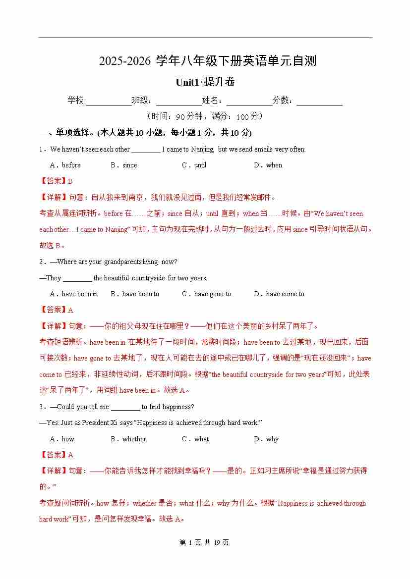 首页 > 全部 > 单元试卷 > 八年级英语下册Unit1单元自测·提升卷(解析版)