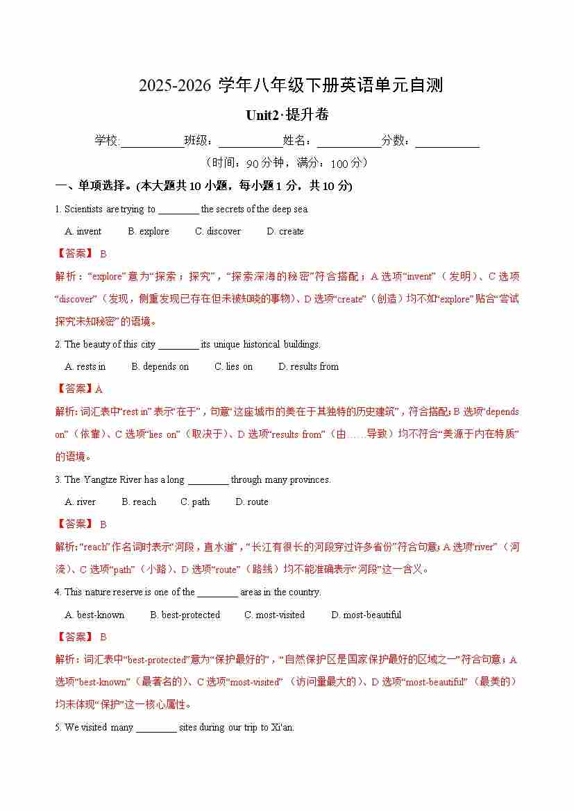 首页 > 全部 > 单元试卷 > 八年级英语下册Unit2单元自测·提升卷(解析版)