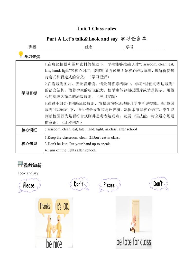 首页 > 全部 > 学习任务单 > Unit 1 第2课时 Part A Let’s learn&Look and say(学习任务单)英语人教PEP版四年级下册(新教材)