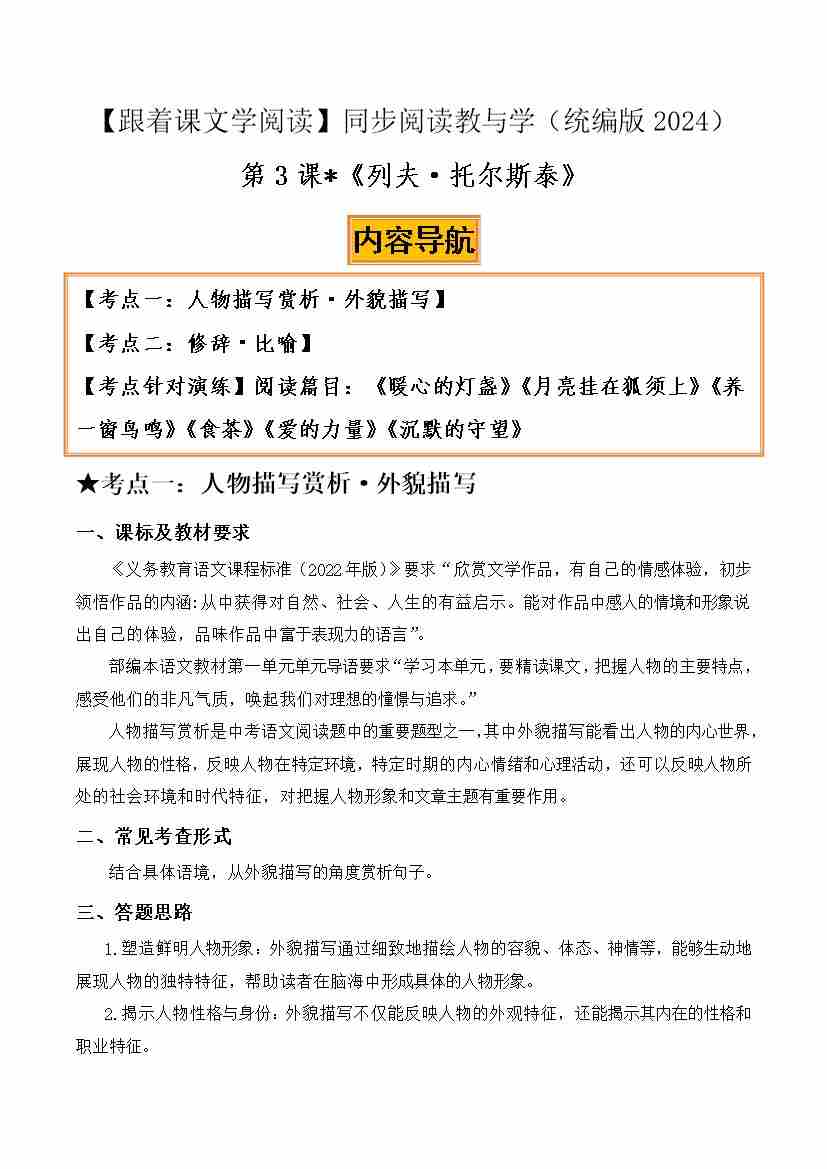 [奥地利]茨威格《列夫·托尔斯泰》:外貌描写、比喻修辞(解析版)