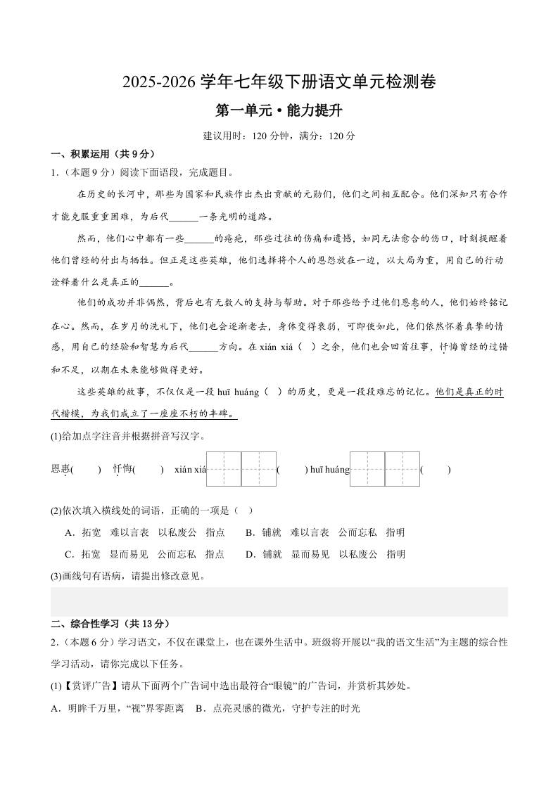 七下语文第一单元 群星闪耀·提升卷(试题版A4)(1)