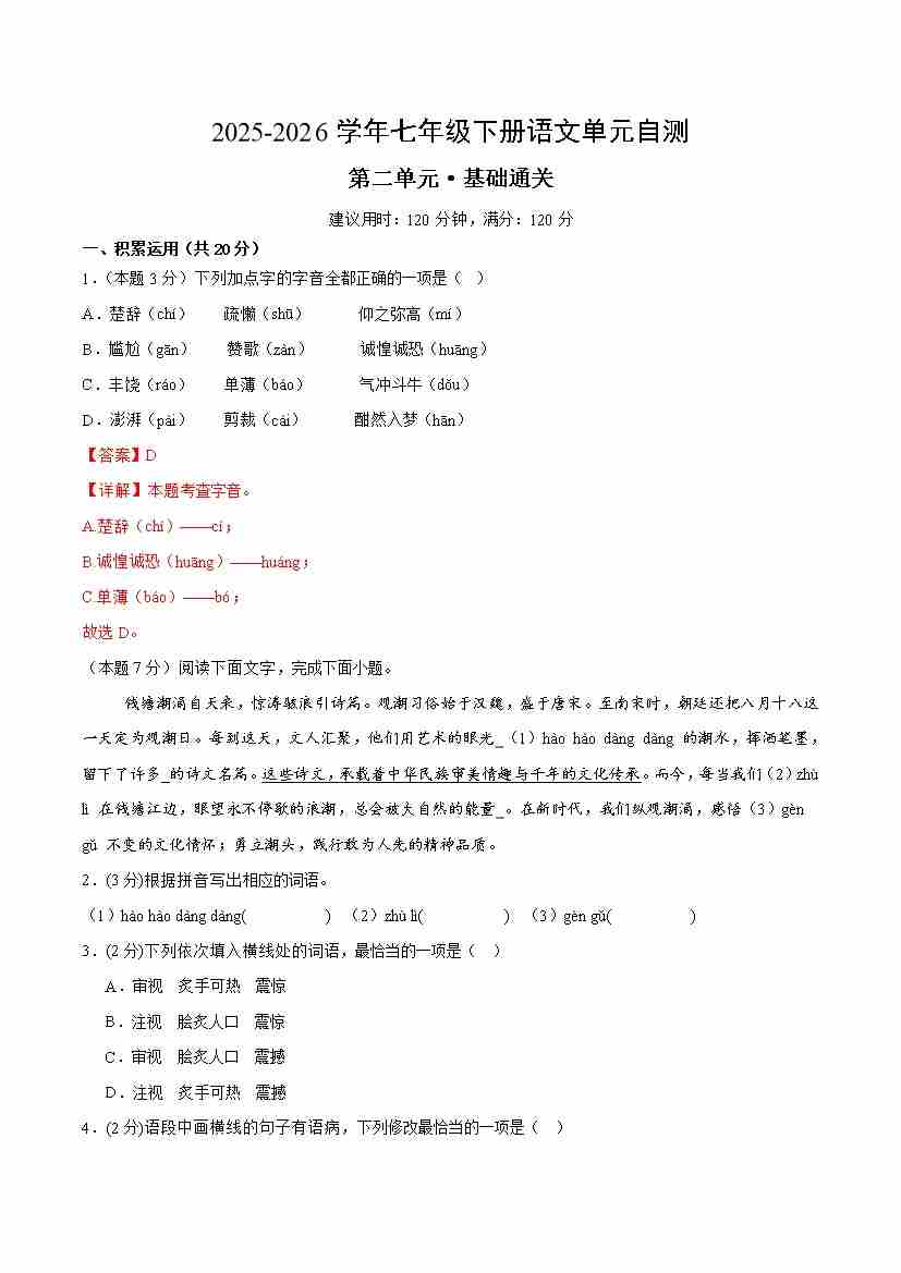 首页 > 全部 > 单元基础卷 > 七下语文第二单元 家国情怀·基础卷(解析版)