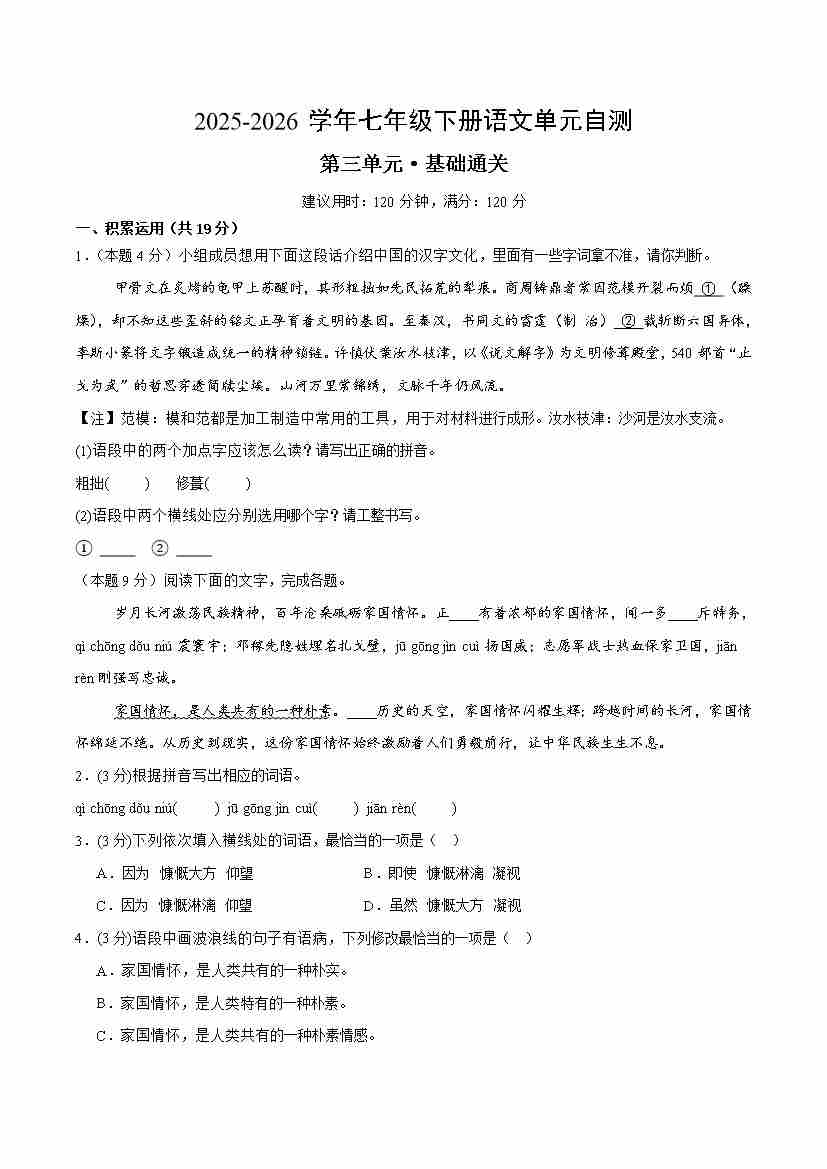 七下语文第三单元 品悟平凡·基础卷(试题版A4)