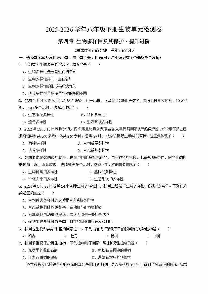 首页 > 全部 > 单元提升卷 > 第六单元第四章 生物多样性及其保护(单元测试·提升卷)(考试版A4)