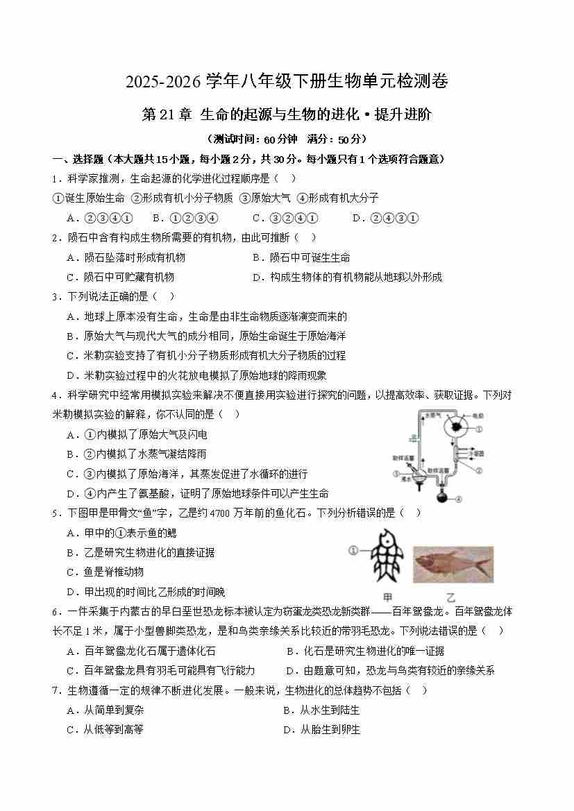 首页 > 全部 > 单元提升卷 > 第21章 生命的起源与生物的进化(单元测试·提升卷)(考试版A4)