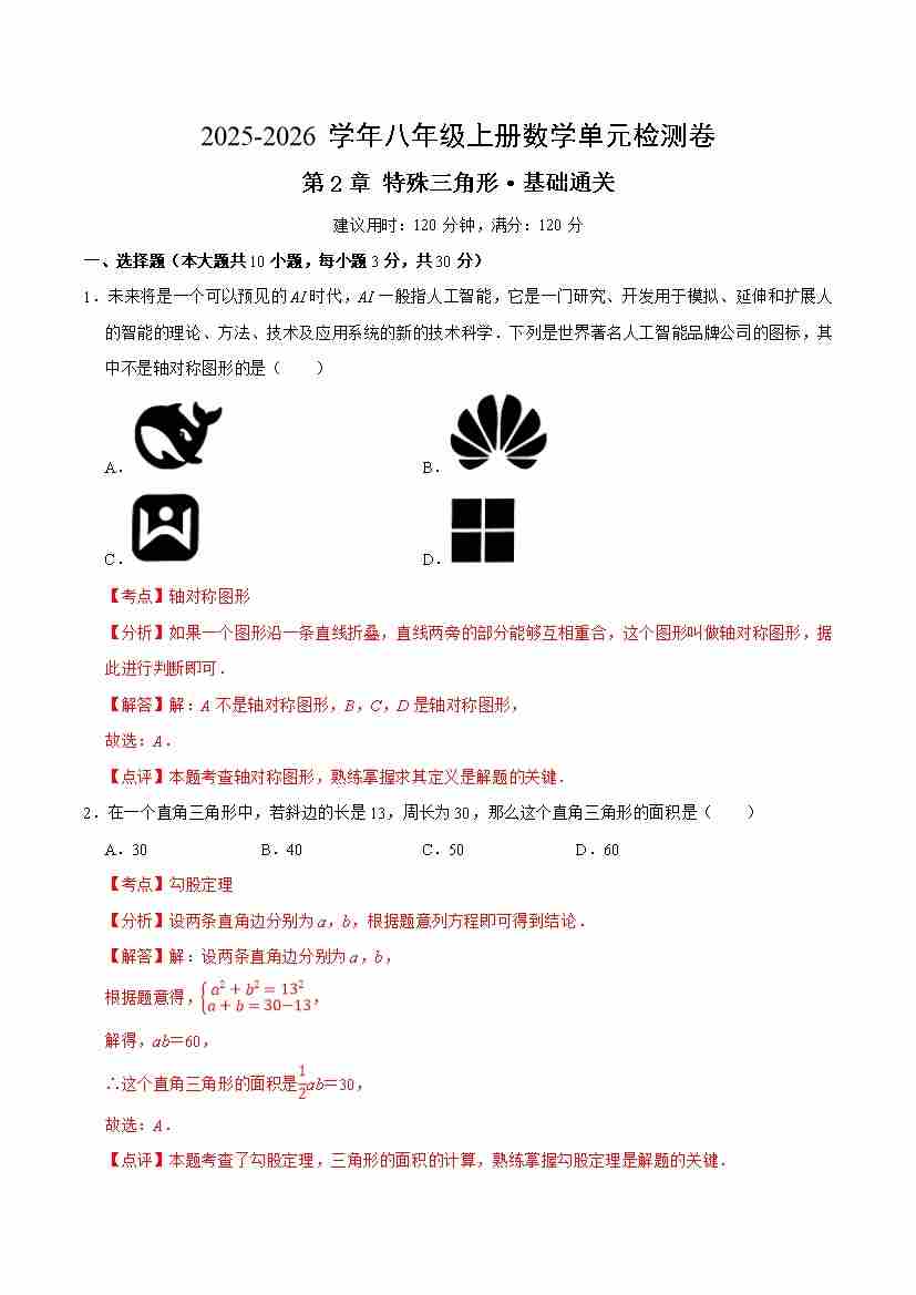 首页 > 全部 > 单元基础卷 > 八上数学第2章 特殊三角形测试·基础卷(解析版)