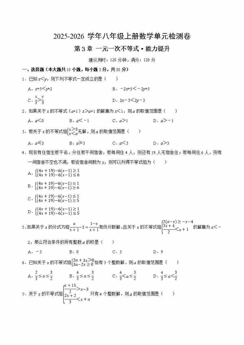 首页 > 全部 > 单元提升卷 > 八上数学第3章 一元一次不等式测试·提升卷(考试版A4)
