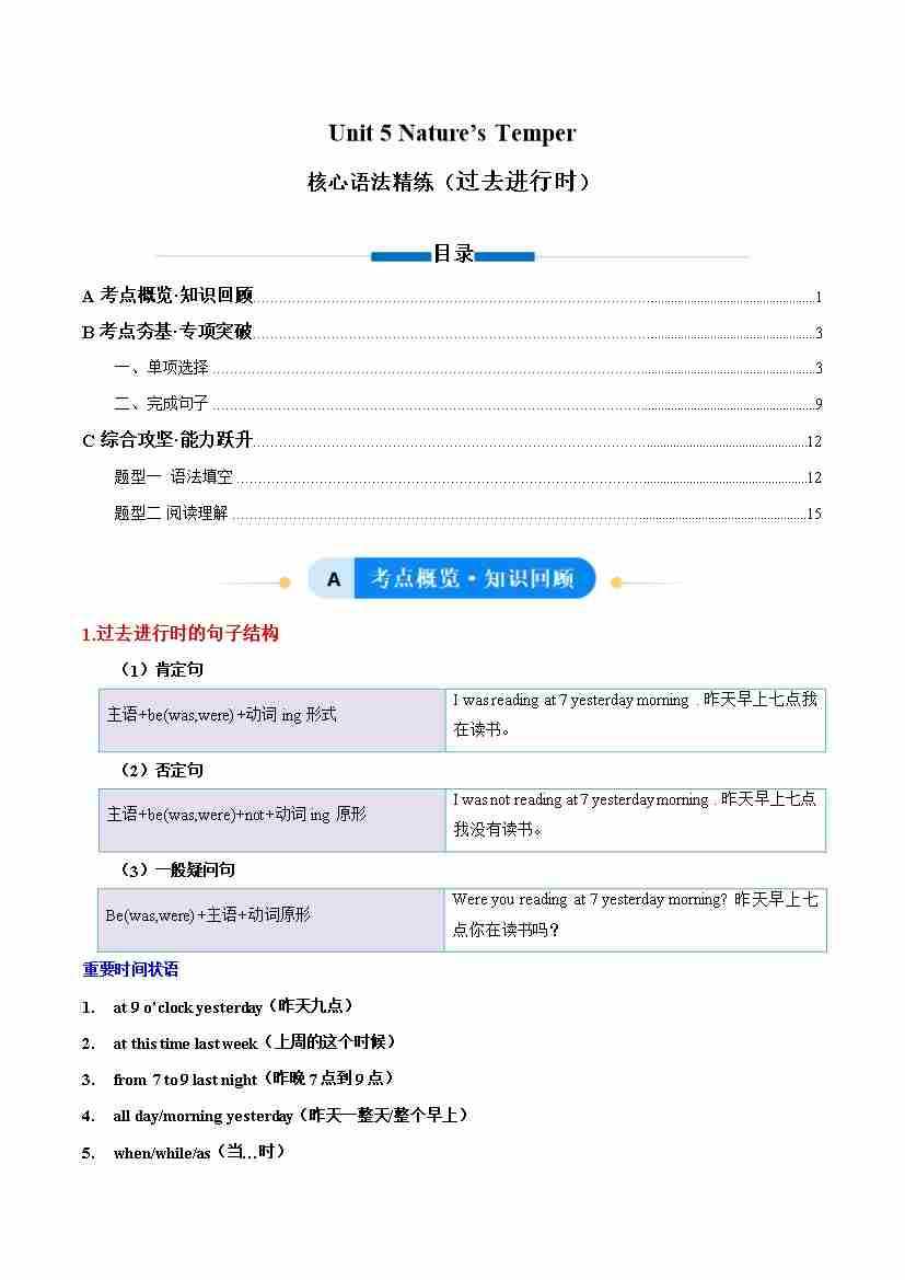 首页 > 全部 > 语法精练 > Unit 5 Nature’s Temper 过去进行时(单元核心语法精练)(原卷版)