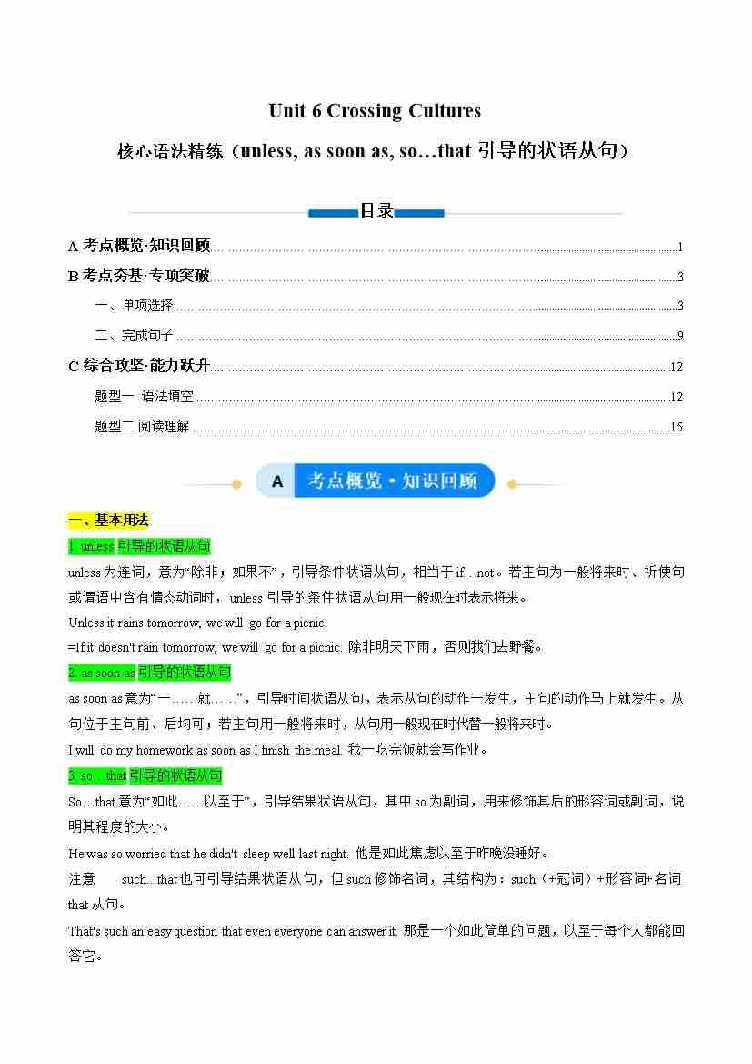 Unit 6 Crossing Cultures unless, as soon as, so…that引导的状语从句(单元核心语法精练)(原卷版)
