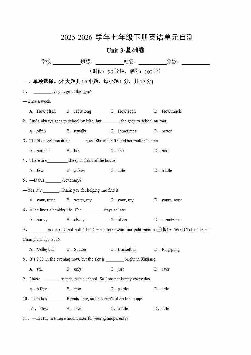 七年级英语下册Unit 3单元自测·基础卷(试题版 A4)