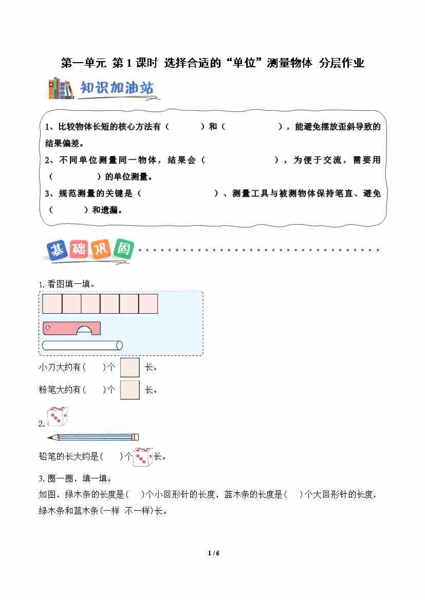 首页 > 全部 > 分层作业 > 第1单元 第1课时 选择合适的“单位 ”测量物体(分层作业)苏教版数学二年级下册(新教材)