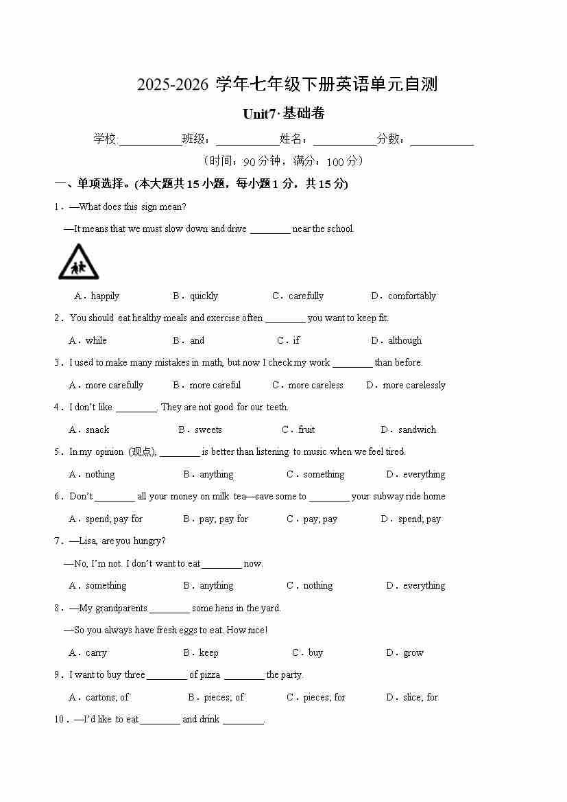 七年级英语下册Unit7单元自测·基础卷(考试版A4)