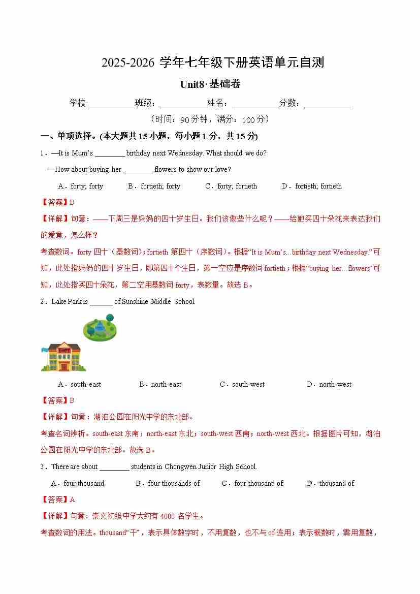 首页 > 全部 > 单元测试 > 七年级英语下册Unit8单元自测·基础卷(解析版)