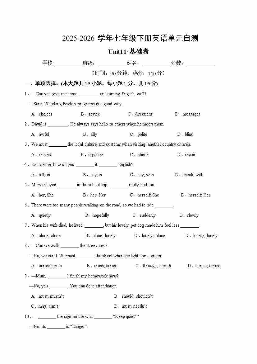 首页 > 全部 > 单元测试 > 七年级英语下册Unit11单元自测·基础卷(试题版A4)