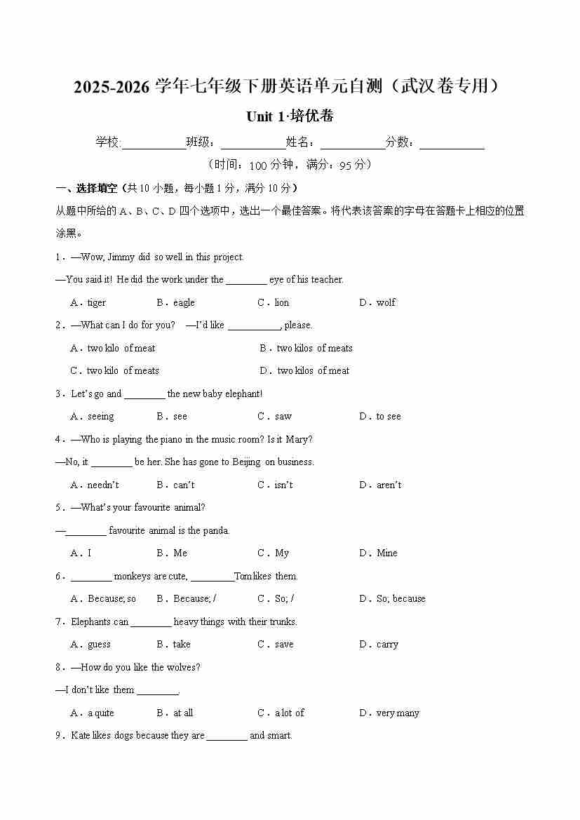 七年级英语下册Unit 1 单元自测·武汉卷专用(试题版A4)