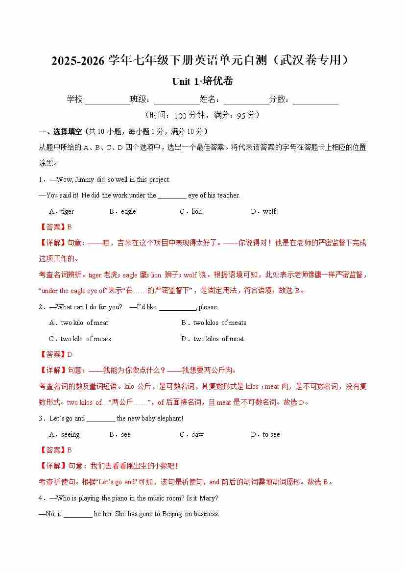 七年级英语下册Unit 1 单元自测·武汉卷专用(解析版)