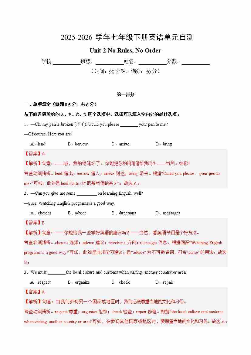 首页 > 全部 > 单元地区卷 > 七年级英语下册Unit 2 单元自测·北京专用(解析版)