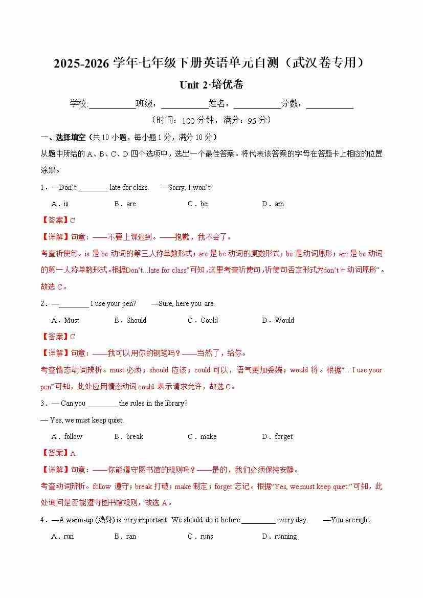 七年级英语下册Unit 2 单元自测·武汉卷专用(解析版)