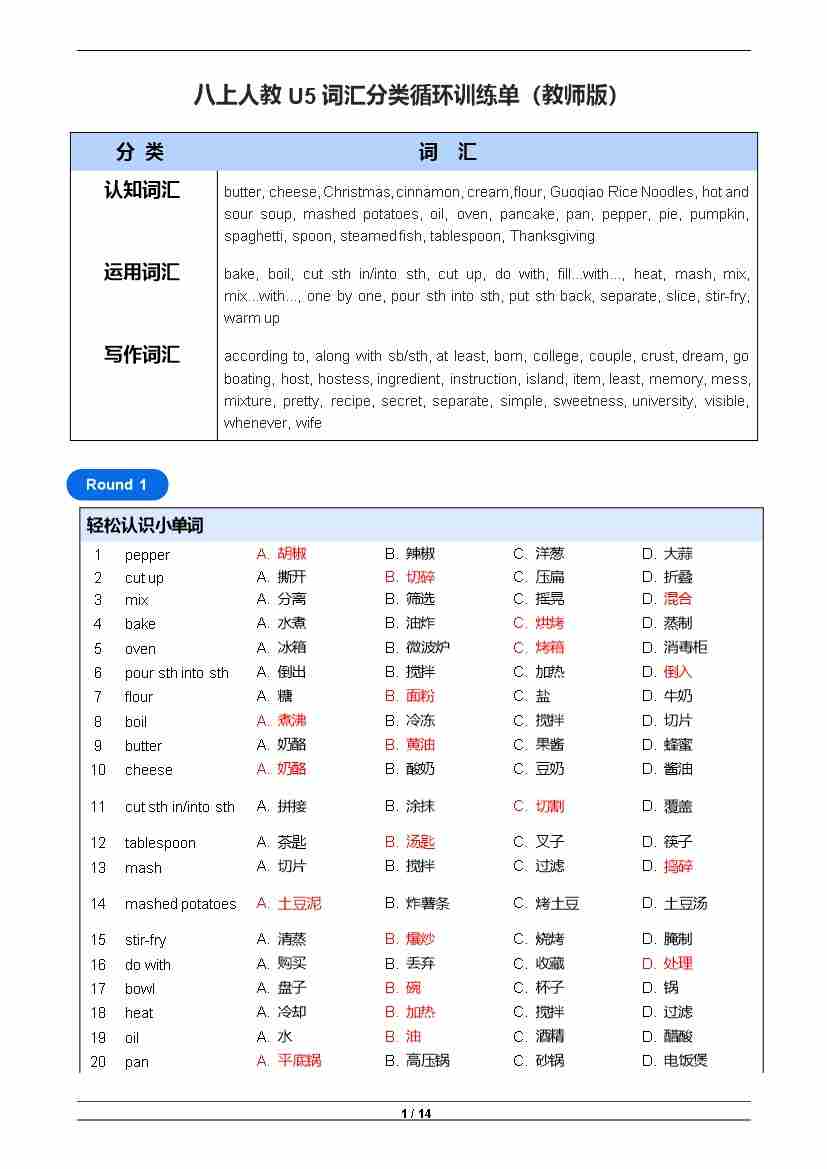 【八上人教U5】词汇分类循环训练单—教师版