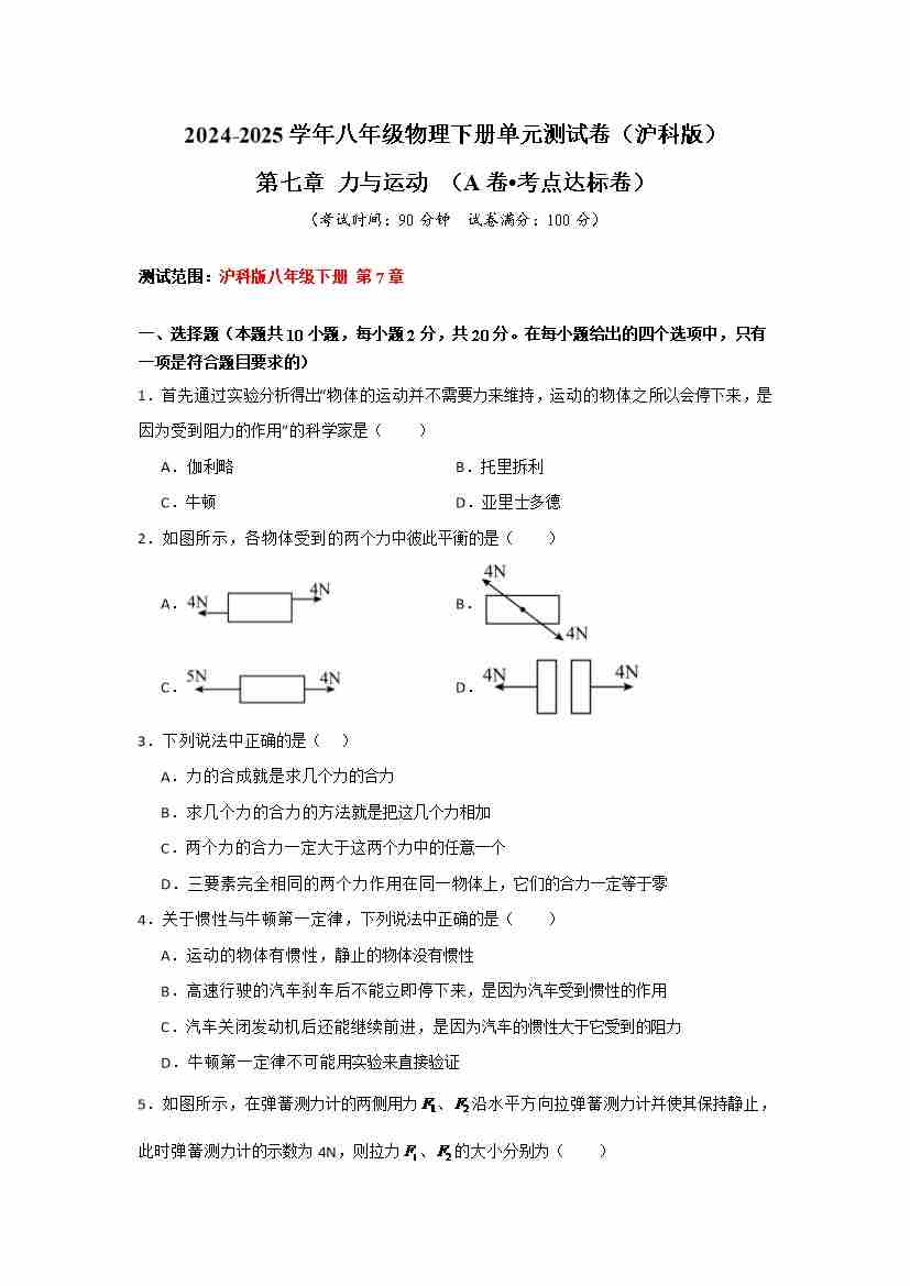 第七章 力与运动 (A卷•考点达标卷)(学生版)