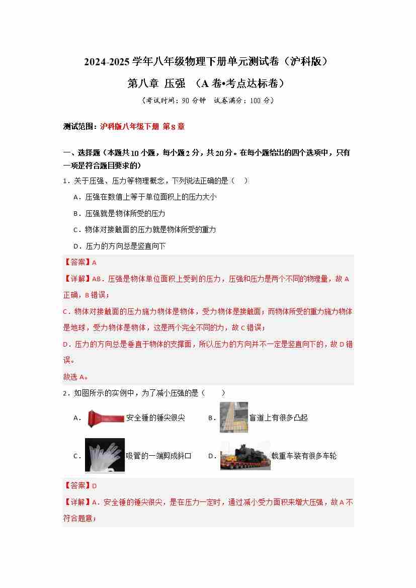 首页 > 全部 > 单元检测 > 第八章 压强(A卷•考点达标卷)(教师版)