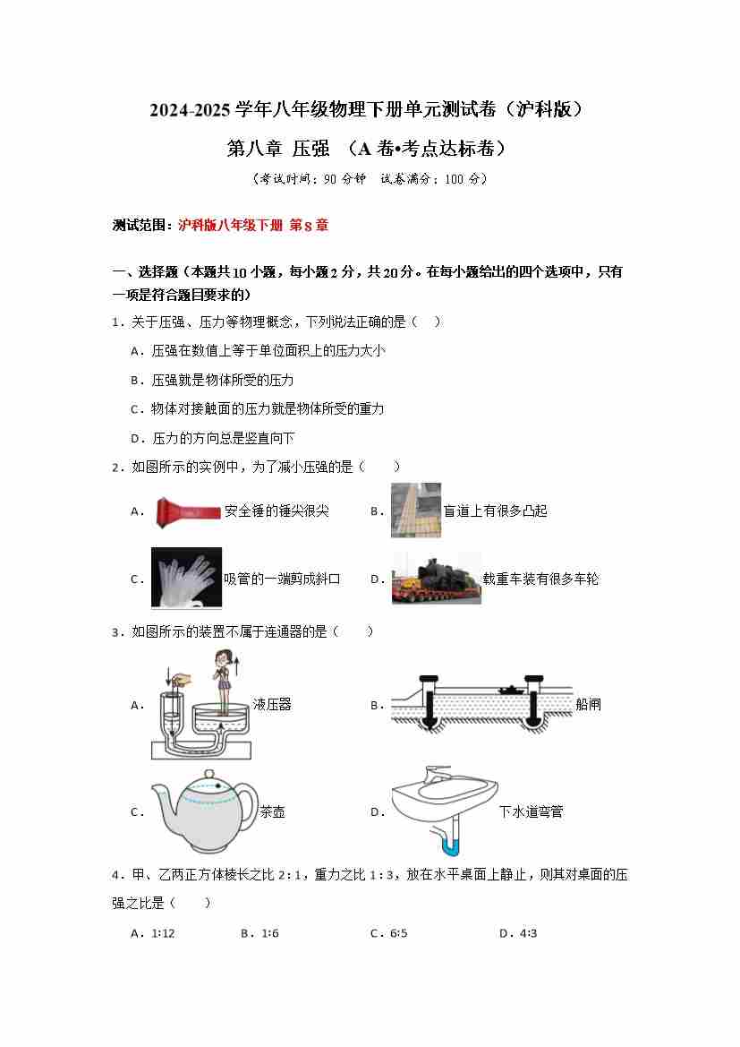 首页 > 全部 > 单元检测 > 第八章 压强(A卷•考点达标卷)(学生版)