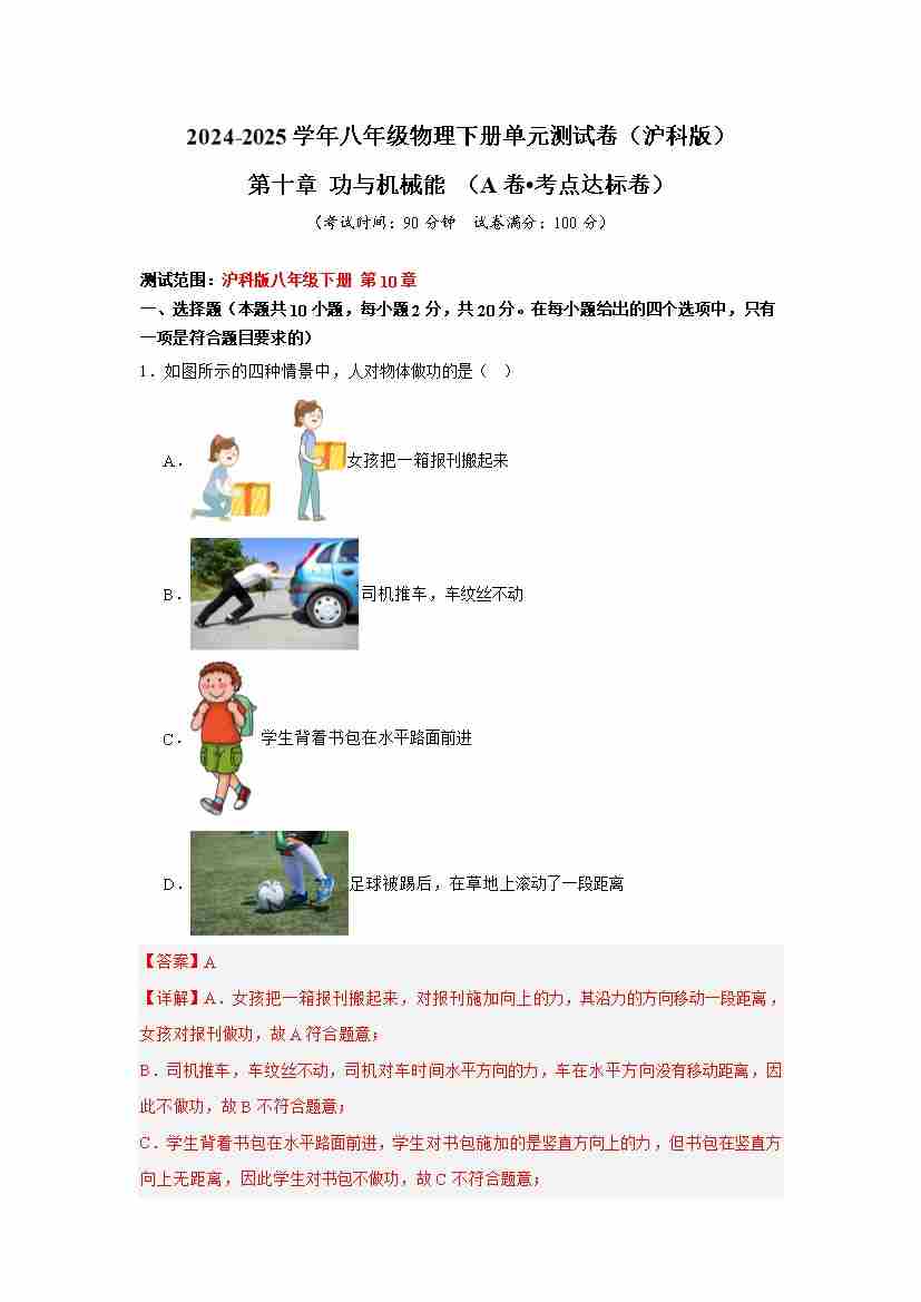 首页 > 全部 > 单元检测 > 第十章 功与机械能 (A卷•考点达标卷)(教师版)
