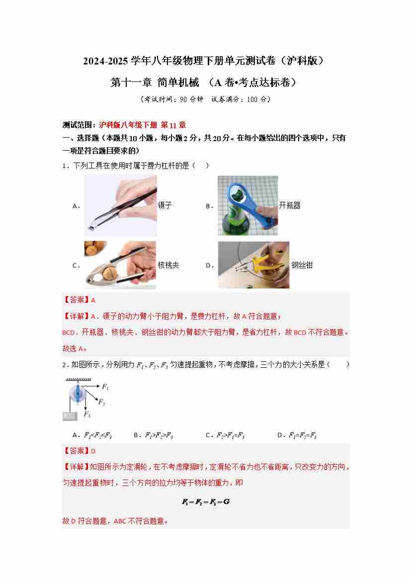 首页 > 全部 > 单元检测 > 第十一章 简单机械(A卷•考点达标卷)(教师版)