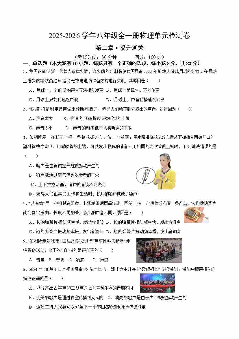 八上物理第二章测试·提升卷(考试版A4)