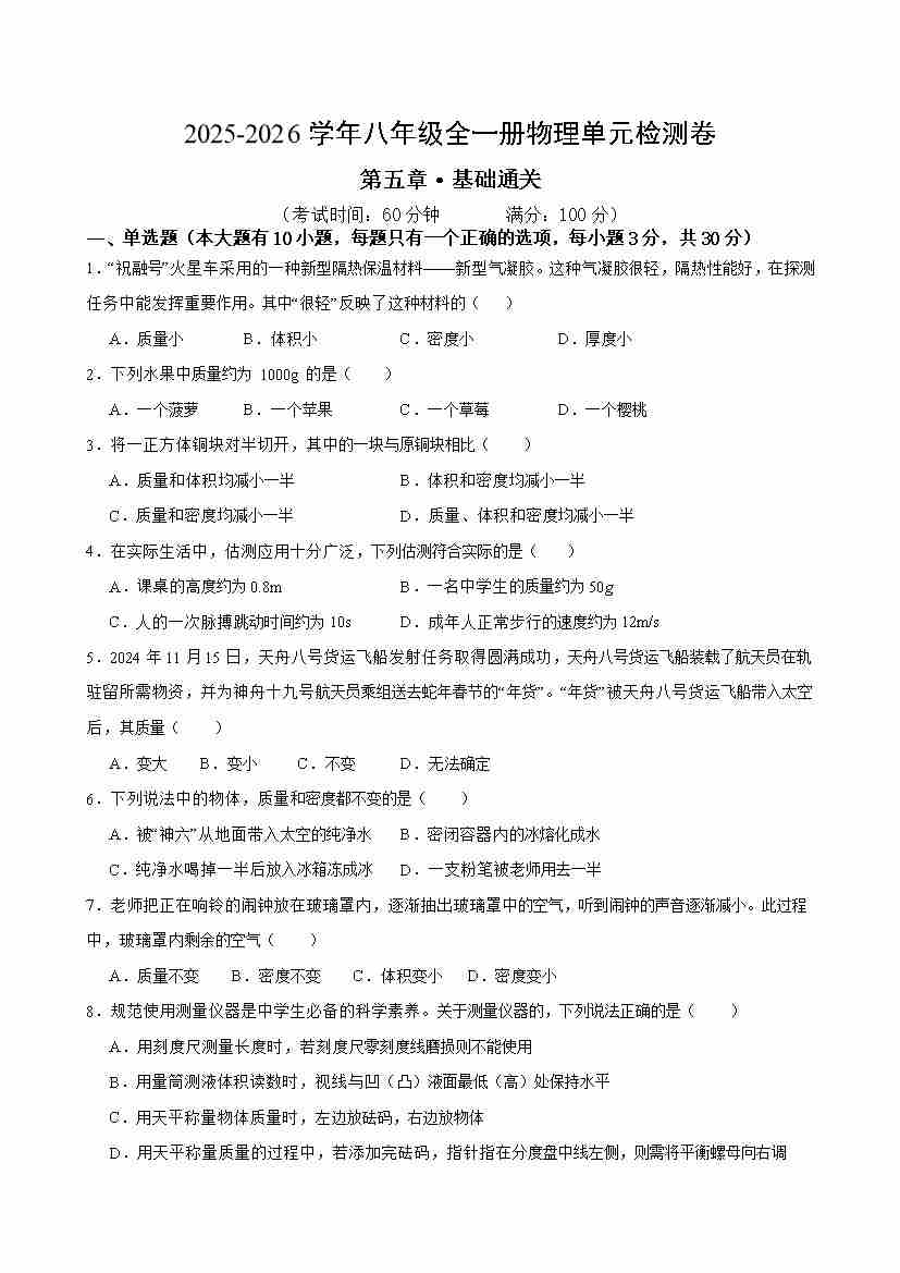 首页 > 全部 > 单元检测2 > 八上物理第五章测试·基础卷(考试版A4)