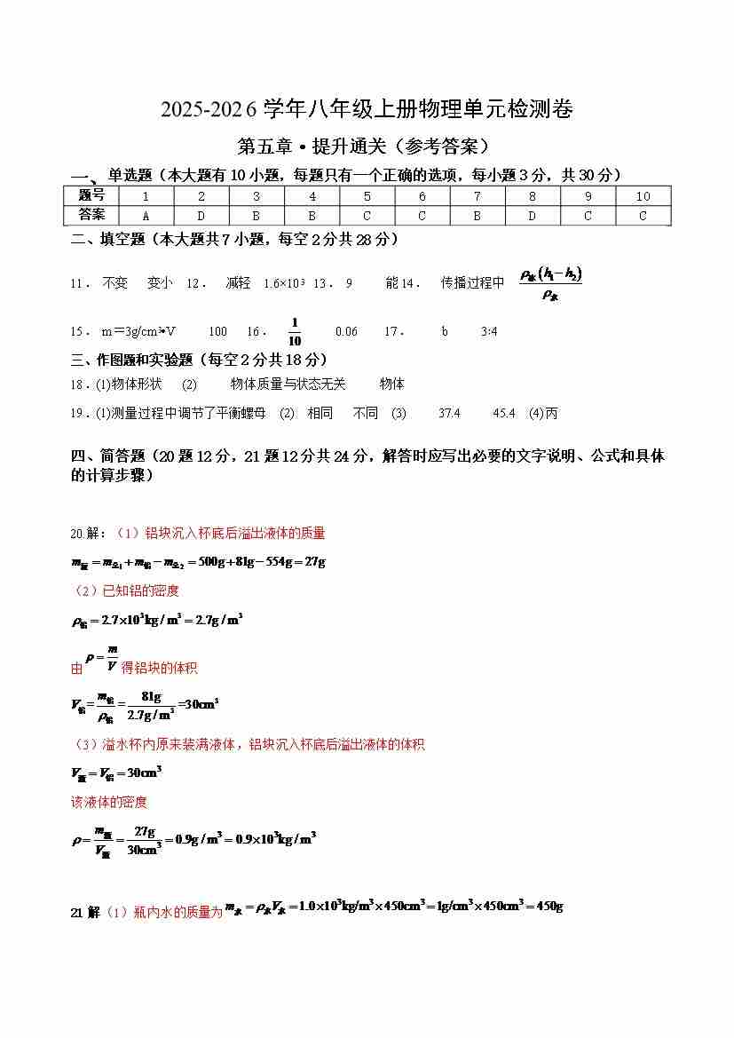 八上物理第五章测试·提升卷(答案及评分标准)