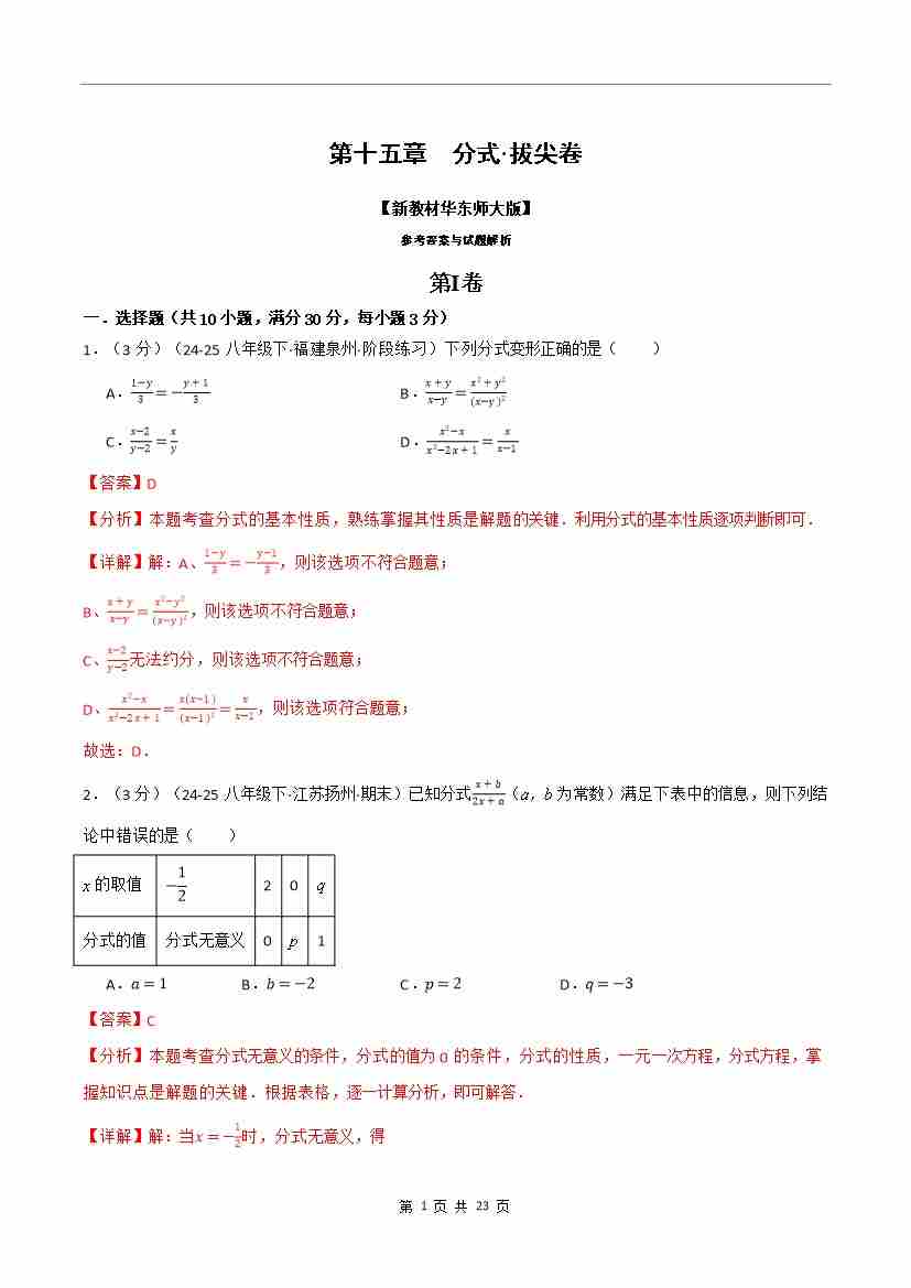 首页 > 全部 > 单元测试 > 第十五章 分式(举一反三单元自测·拔尖卷)数学新教材华东师大版八年级下册(解析版)