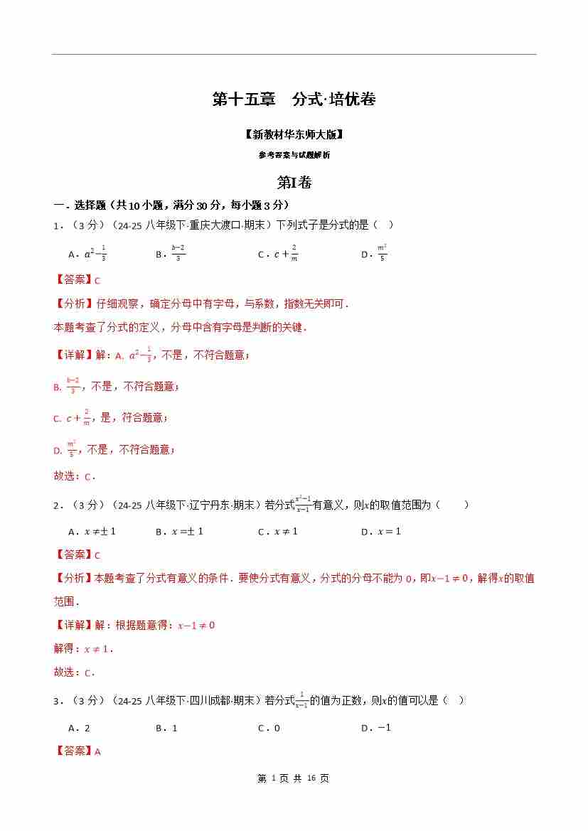 首页 > 全部 > 单元测试 > 第十五章 分式(举一反三单元自测·培优卷)数学新教材华东师大版八年级下册(解析版)