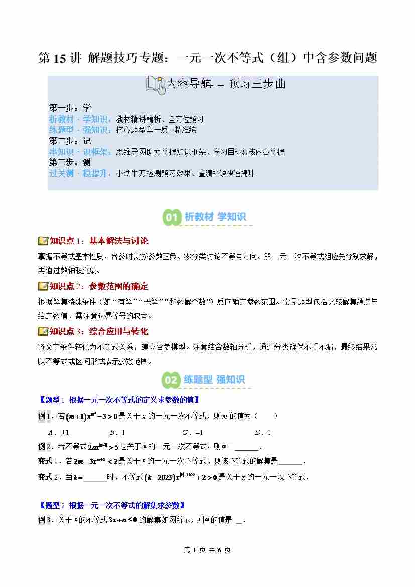 首页 > 全部 > 寒假讲义 > ②寒假预习-第15讲 解题技巧专题:一元一次不等式(组)中含参数问题(3知识点7大题型过关测)(学生版)-2026年八年级数学寒假衔接讲练 (北师大版-新教材)