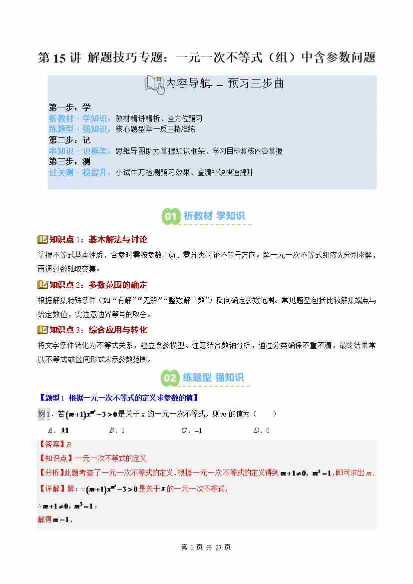 首页 > 全部 > 寒假讲义 > ②寒假预习-第15讲 解题技巧专题:一元一次不等式(组)中含参数问题(3知识点7大题型过关测)(教师版)-2026年八年级数学寒假衔接讲练 (北师大版-新教材)