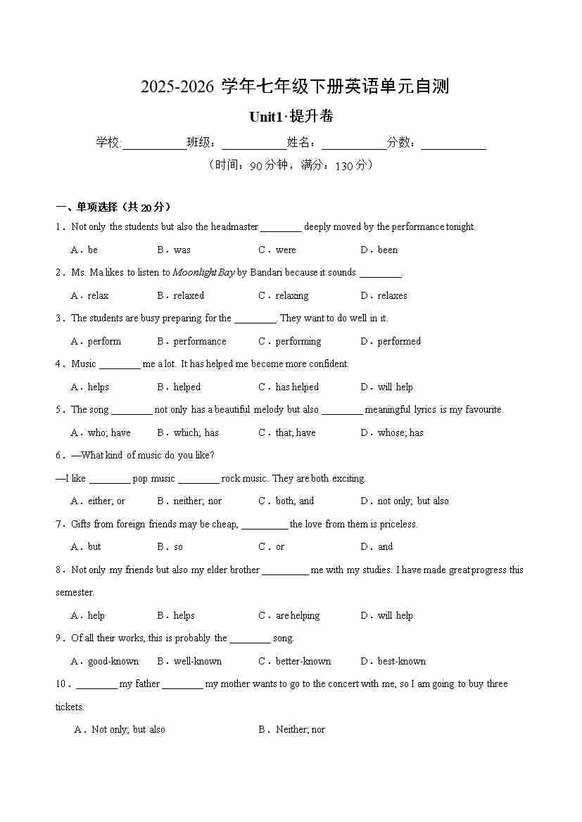 首页 > 全部 > 单元提升卷 > 七年级英语下册沪教54Unit1单元自测·提升卷(试题版A4)