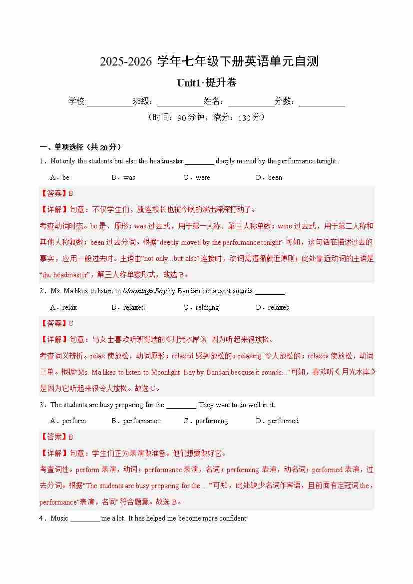 首页 > 全部 > 单元提升卷 > 七年级英语下册沪教54Unit1单元自测·提升卷(解析版)