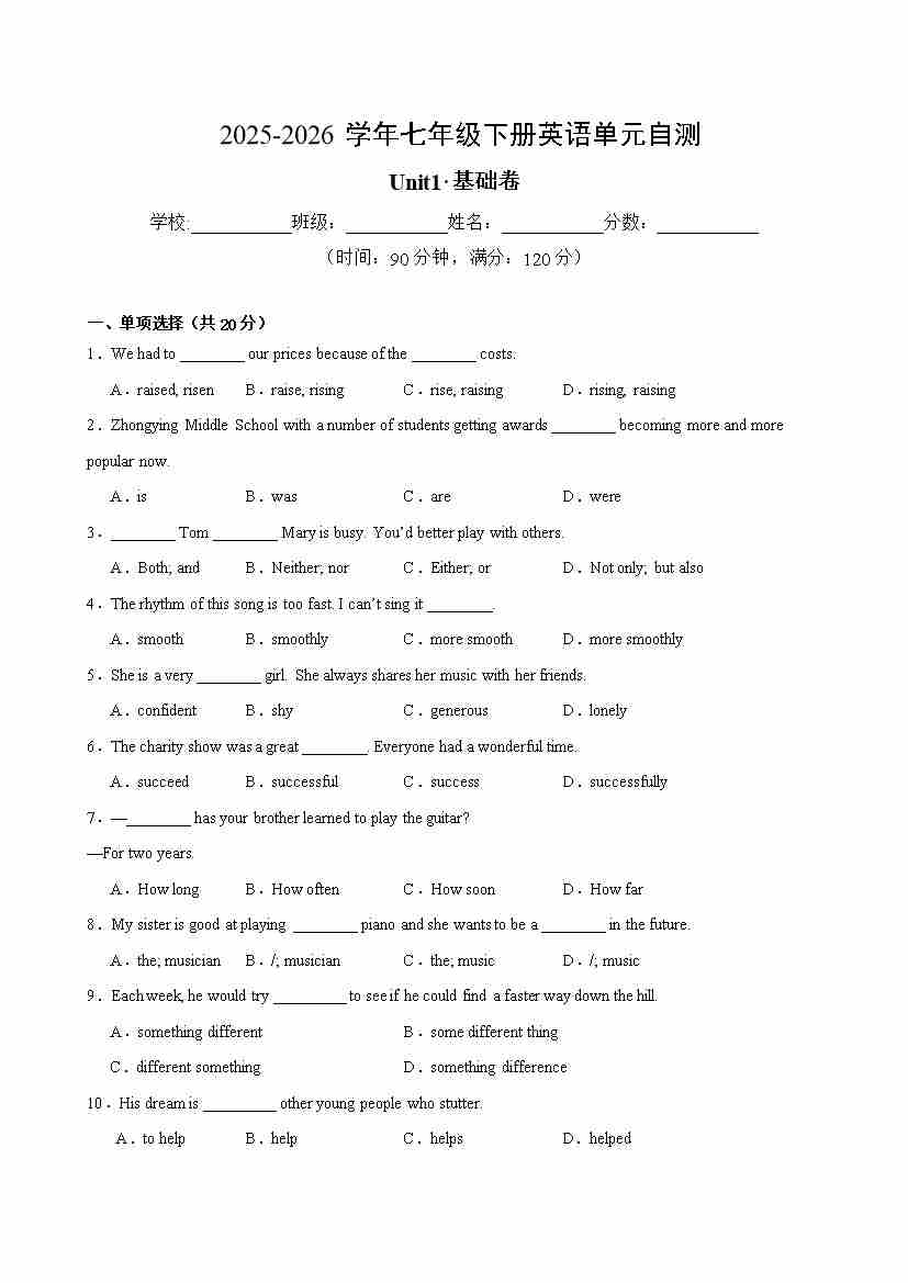首页 > 全部 > 单元提升卷 > 七年级英语下册沪教54Unit1单元自测·基础卷(试题版A4)