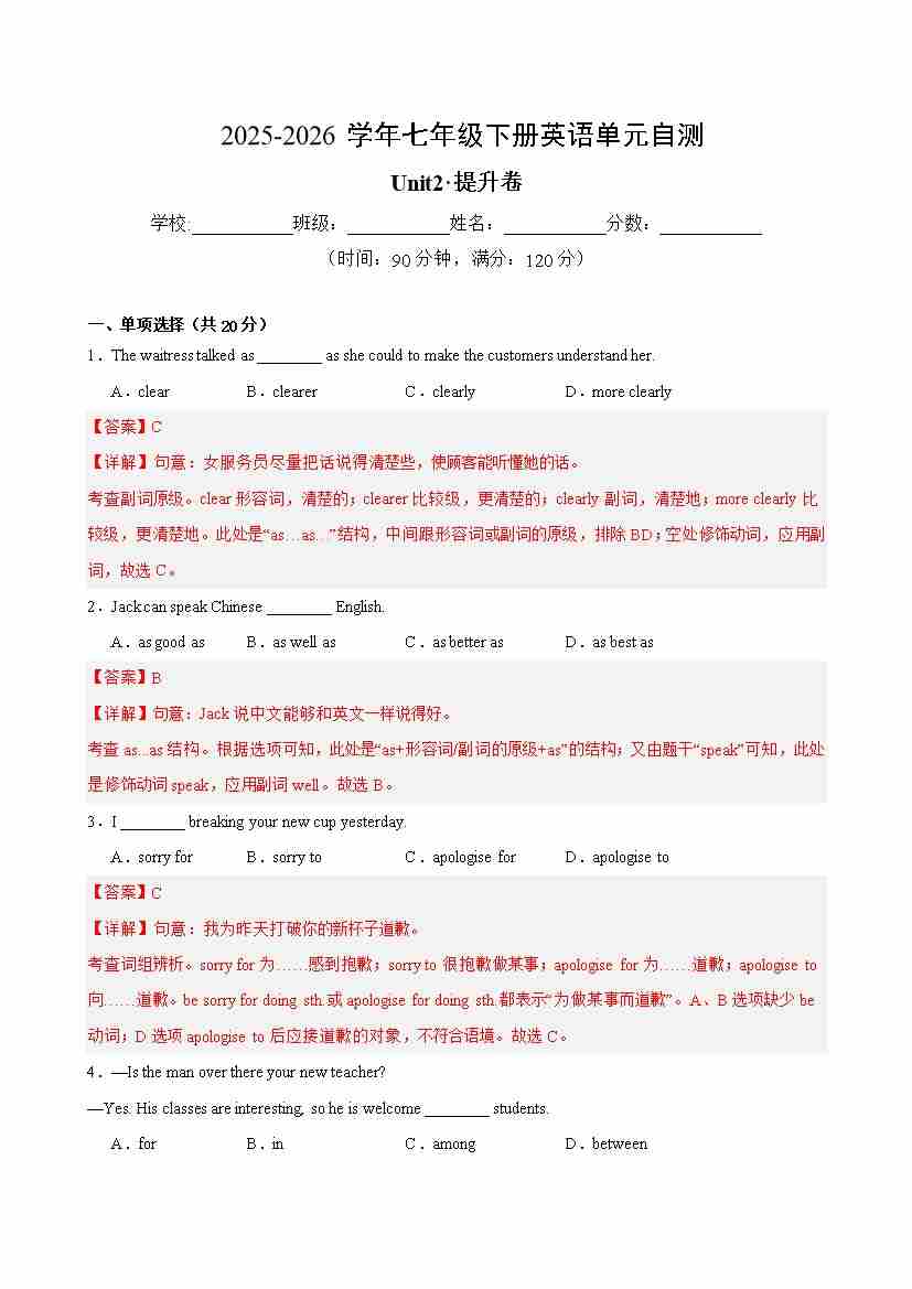 首页 > 全部 > 单元提升卷 > 七年级英语下册沪教54Unit2单元自测·提升卷(解析版)