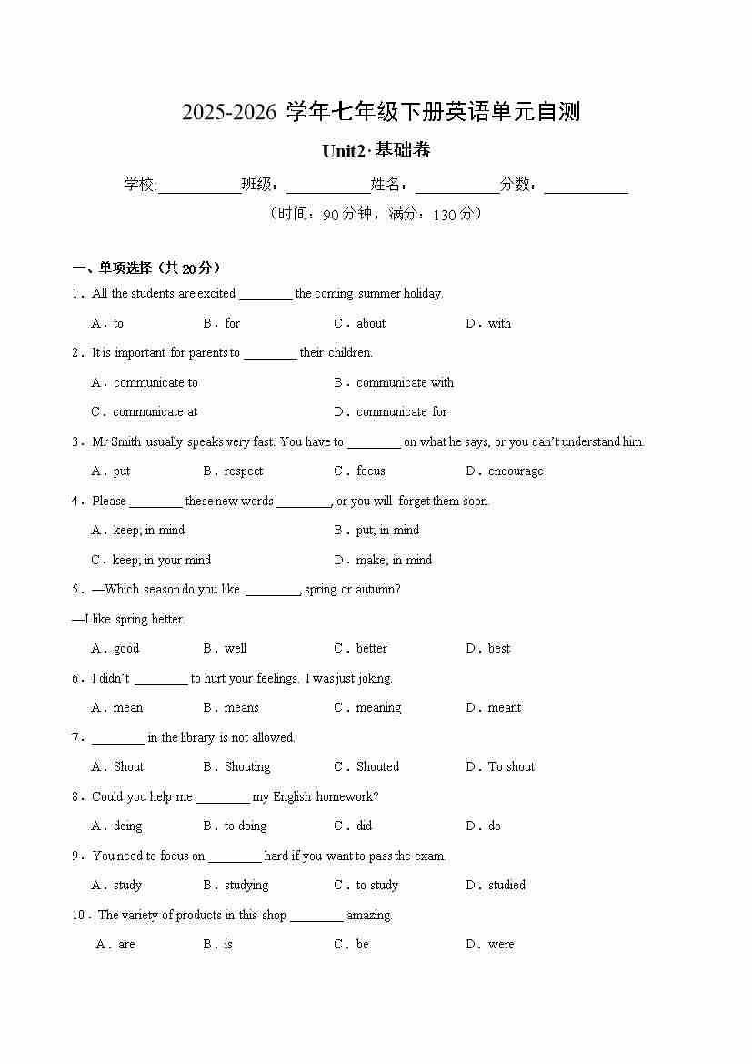 七年级英语下册沪教54Unit2单元自测·基础卷(试题版A4)