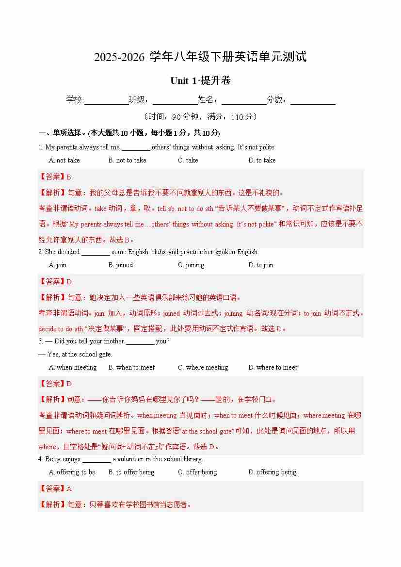 首页 > 全部 > 单元试卷 > 八年级英语下册Unit1单元测试·提升卷(解析版)