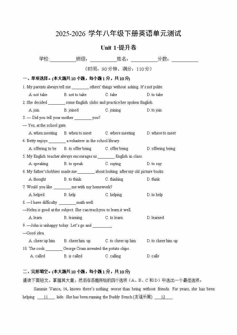 八年级英语下册Unit1单元测试·提升卷(考试版A4)