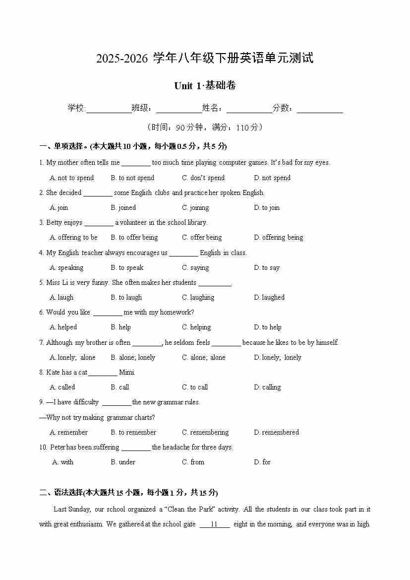 首页 > 全部 > 单元试卷 > 八年级英语下册Unit1单元测试·基础卷(考试版A4)