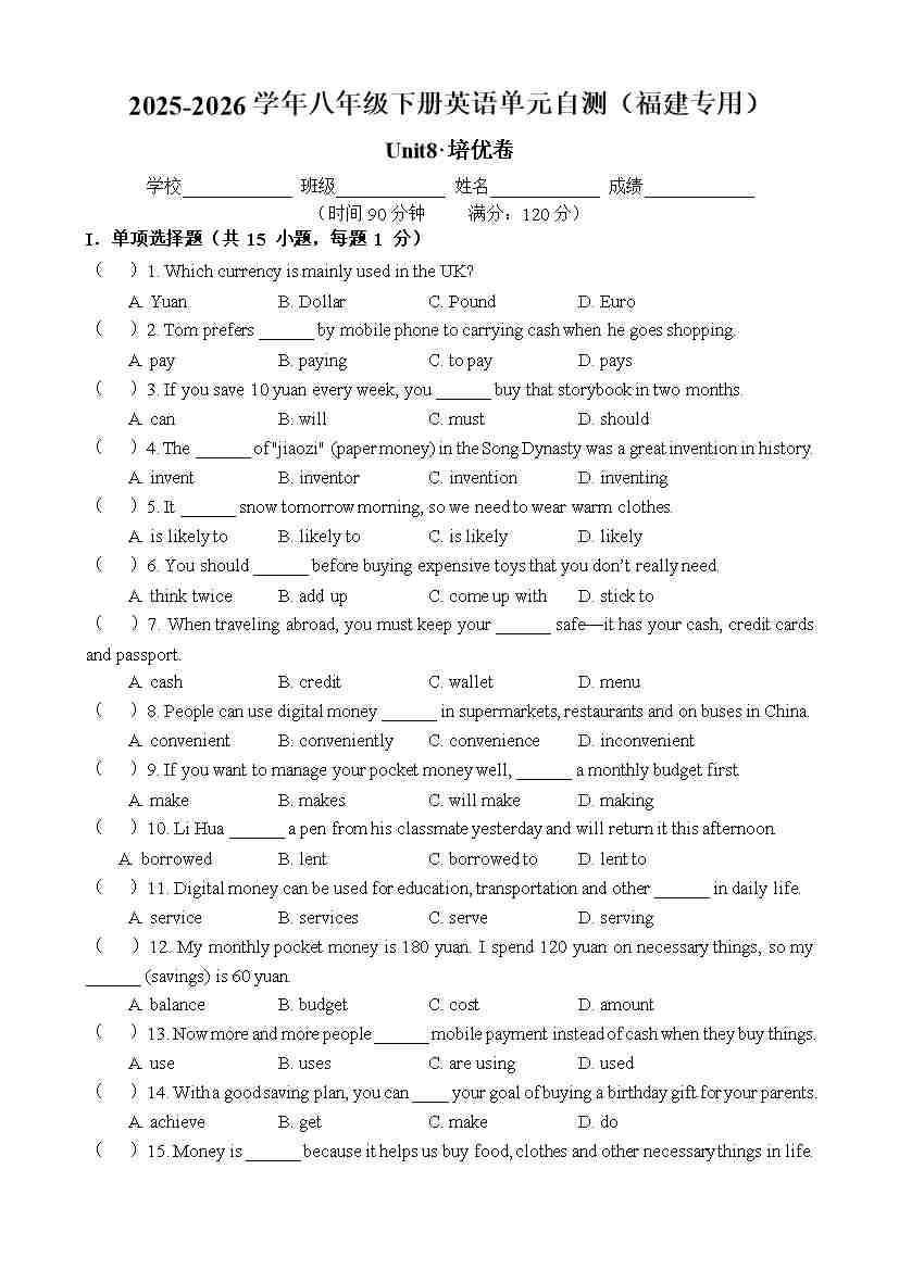 首页 > 全部 > 单元测试 > 八年级英语下册Unit8单元自测·福建专用(考试版A4)
