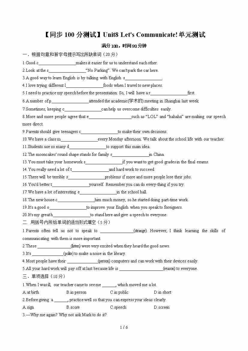首页 > 全部 > 同步100系列 > Unit8 Let's Communicate!(原卷版)同步单元测试---人教版