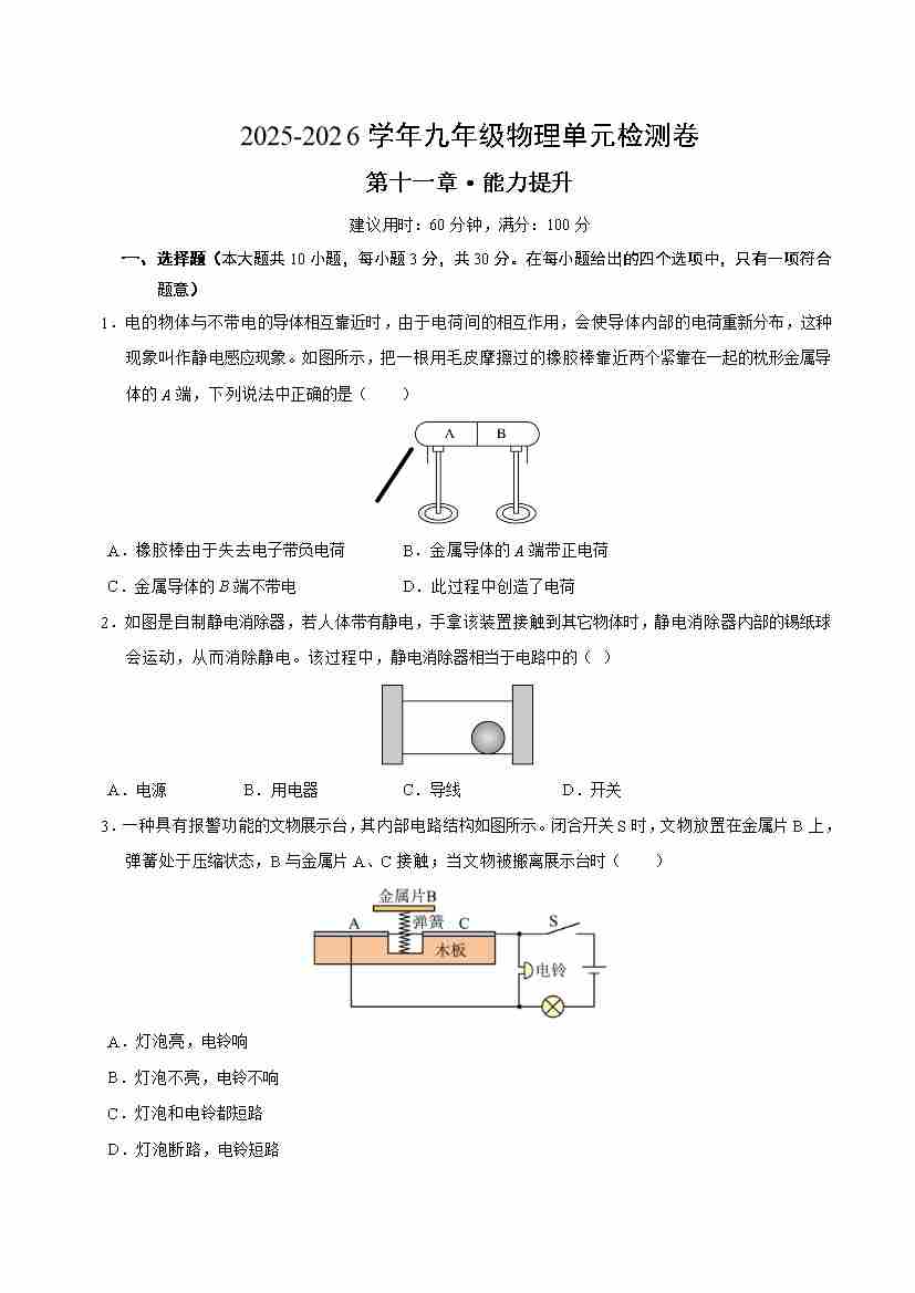 首页 > 全部 > 单元测试 > 第十一章 电路、电流和电压(单元测试·提升卷)(考试版A4)