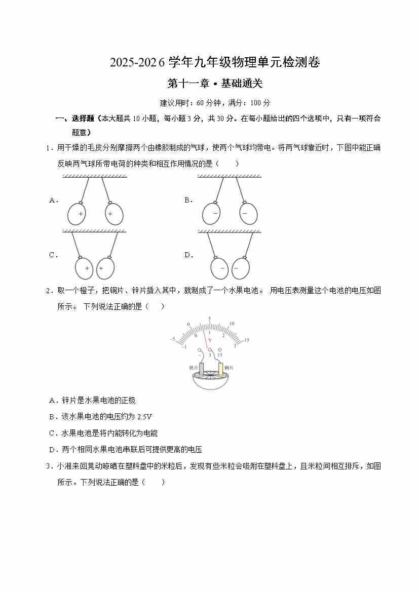 首页 > 全部 > 单元测试 > 第十一章 电路、电流和电压(单元测试·基础卷)(考试版A4)