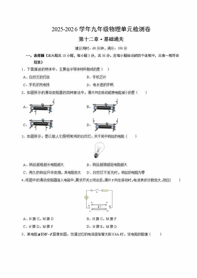 首页 > 全部 > 单元测试 > 第十二章 欧姆定律(单元测试·基础卷)(考试版A4)